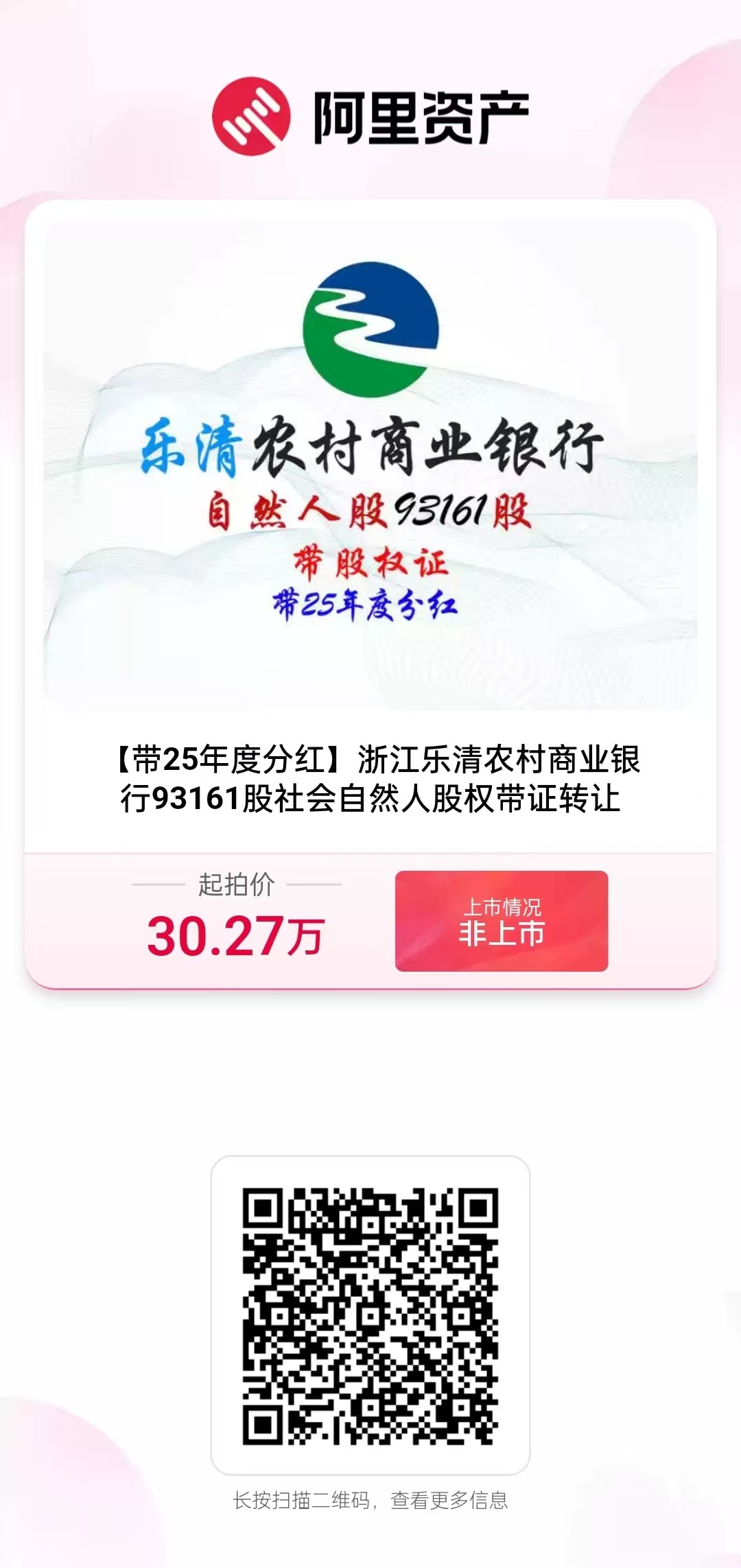 拍品名称:浙江乐清农村商业银行股份有限公司93161股自然人股
